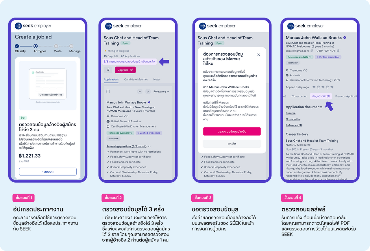 มั่นใจได้เลยว่าข้อมูลสำหรับการตรวจสอบข้อมูลอ้างอิงบน SEEK นั้นปลอดภัย มีเพียงทีมหรือผู้ที่เกี่ยวข้องเท่านั้นที่จะสามารถเข้าถึงการตรวจสอบได้ ผู้สมัครสามารถติดตามความคืบหน้าของการดำเนินการได้ แต่จะไม่สามารถดูคำตอบสำหรับข้อมูลอ้างอิงได้