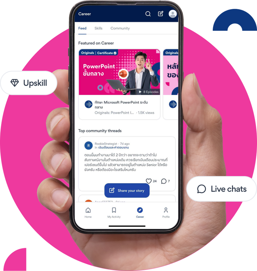 ชุมชนด้านอาชีพของเราเต็มไปด้วยกลุ่มผู้สมัครจำนวนมากที่เชื่อมต่อกันด้วยคำแนะนำด้านอาชีพจากผู้เชี่ยวชาญ การแบ่งปันประสบการณ์ของเพื่อนร่วมอาชีพ รวมถึงแหล่งพัฒนาทักษะที่หลากหลาย เพื่อให้ผู้สมัครทุกคน ทั้งที่กำลังมองหางานใหม่หรือผู้ที่ยังไม่คิดจะเปลี่ยนงานได้มีส่วนร่วม เรียนรู้ และพร้อมรับโอกาสใหม่ ๆ อยู่เสมอ