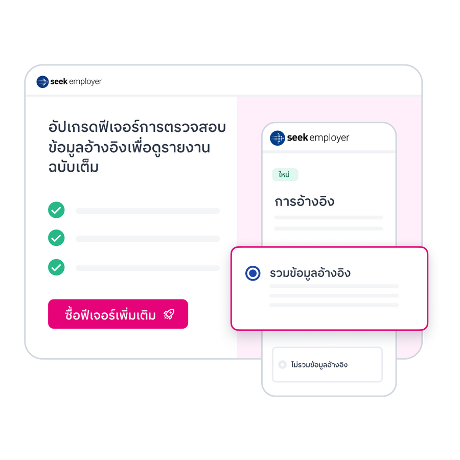 เข้าถึงข้อมูลผู้อ้างอิงของผู้สมัครได้ง่าย ๆ โดยการตรวจสอบข้อมูลอ้างอิงที่ผู้สมัครระบุไว้ได้ทันที ช่วยให้คุณตัดสินใจจ้างงานได้รวดเร็วยิ่งขึ้น เริ่มต้นขอตรวจสอบข้อมูลอ้างอิงได้ฟรี 1 ครั้งต่อประกาศงาน และซื้อเพิ่มได้ตามต้องการ