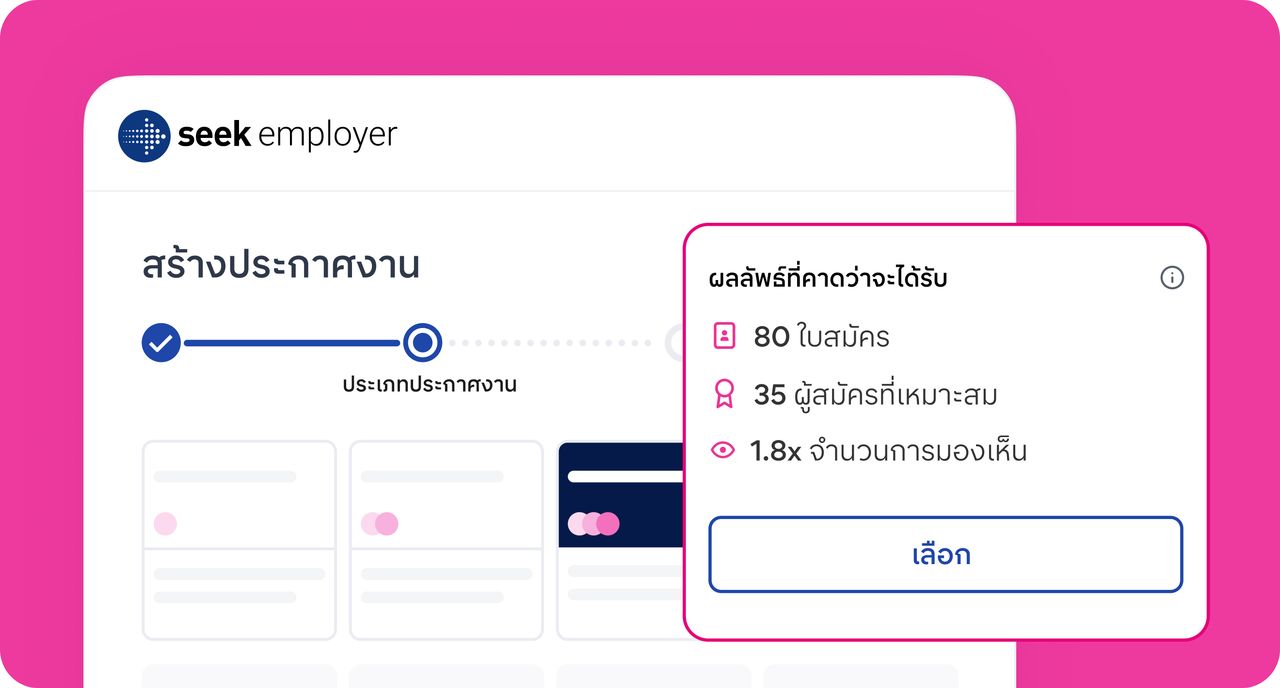 เมื่อลงประกาศงานบน SEEK คุณจะเห็นการคาดการณ์จำนวนผู้สมัครที่เหมาะสมกับตำแหน่งงาน ช่วยให้คุณวางแผนการสรรหาและตัดสินใจจ้างงานได้อย่างมั่นใจ