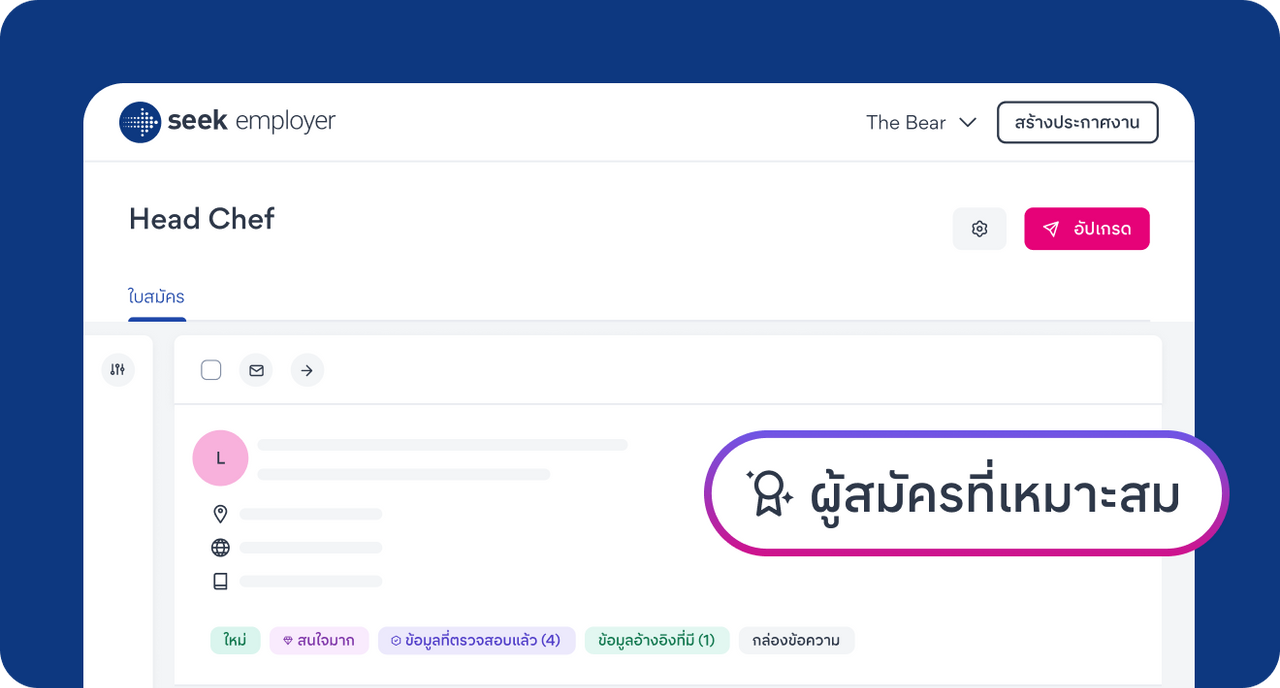 ด้วยข้อมูลเชิงลึกเกี่ยวกับตลาดแรงงานและการเรียนรู้จากพฤติกรรม seekAi ช่วยระบุผู้สมัครที่มีความเหมาะสมที่สุด (High-fit) สำหรับตำแหน่งงานของคุณ