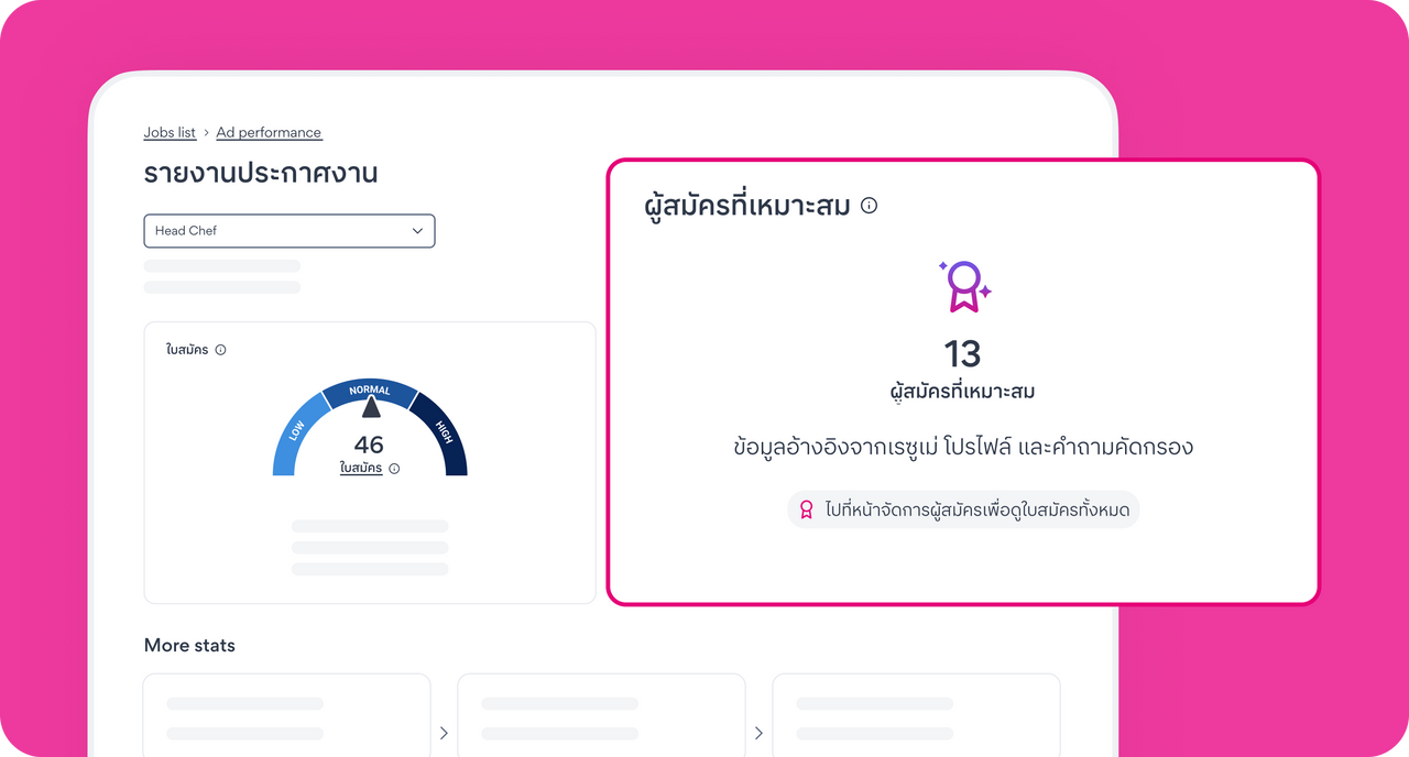 เมื่อผู้ประกอบการได้รับใบสมัครผ่านระบบจัดการผู้สมัคร คุณจะเห็นว่าใครคือผู้สมัครที่เหมาะสมกับตำแหน่งงานของคุณ ข้อมูลเหล่านี้จะช่วยให้คุณคัดกรองผู้สมัครที่ใช่ได้รวดเร็วขึ้น ประหยัดเวลาในขั้นตอนการสรรหา และตัดสินใจจ้างงานได้อย่างมั่นใจ