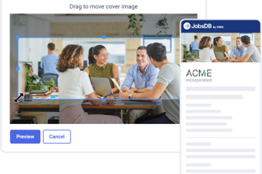 สร้างแบรนด์ให้โดดเด่นด้วยการเพิ่มโลโก้องค์กร ภาพแบนเนอร์ และจุดขายสำคัญ 3 ข้อ เพื่อดึงดูดผู้หางานที่ตรงใจ